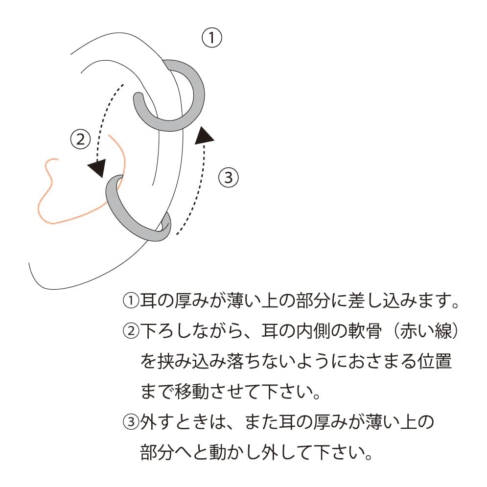 写真最後にある着脱の仕方でも、耳全体が厚くて入らない方、軟骨がとても薄くて簡単にとれてしまう方は、反対の耳で試してみてください。左右の耳の形は意外に違うのです。